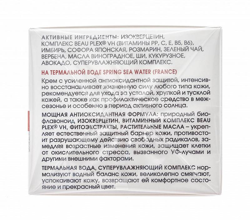 Природный биофлавоноид ИЗОКВЕРЦЕТИН, ВИТАМИННЫЙ КОМПЛЕКС BEAU PLEX® VH , ФИТОЭКСТРАКТЫ и РАСТИТЕЛЬНЫЕ МАСЛА укрепляет естественный защитный барьер кожи, противостоит разрушающему действию свободных радикалов, замедляя возрастные изменения кожи, защищает клетки от окислительного стресса, вызванного УФ-лучами и другими внешними факторами.