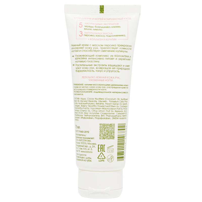 Нежный крем с маслом персика прекрасно увлажняет кожу рук, препятствует ломкости ногтей и способствует смягчению кутикулы. Ухаживающий комплекс из коллагена и кератина интенсивно питает и укрепляет ногтевую пластину, устраняет сухость кожи, возвращая ей природную бархатистость, тонус и упругость. Растительные экстракты защищают и смягчают кожу рук, возвращая ей природную бархатистость, тонус и упругость.