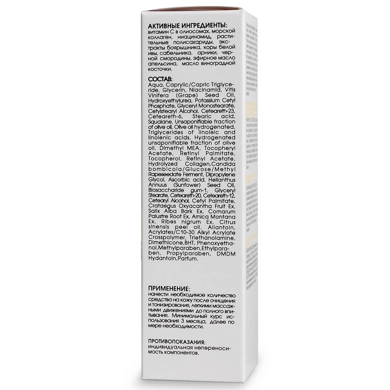 Состав: aqua, caprylic/capric triglyceride, glycerin, niacinamid, vitis vinifera (grape) seed oil, hydroxyethylurea, potassium cetyl phosphate, glyceryl monostearate, cetylstearyl alcohol, ceteareth-23, ceteareth-6, stearic acid, squalane, unsaponifiable fraction of olive oil, olive oil hydrogenated, triglycerides of linoleic and linolenic acids, hydrogenated unsaponifiable fraction of olive oil, dimethyl mea, tocopheryl acetate, retinyl palmitate, tocopherol, retinyl acetate, hydrolyzed collagen, candida bombicola/ glucose/ methyl rapeseedate ferment, dipropylene glycol, ascorbic acid, helianthus annuus (sunfower) seed oil, biosaccharide gum-1, glyceryl stearate, ceteareth-20, ceteareth-12, cetearyl alcohol, cetyl palmitate, crataegus oxyacantha fruit extract, salix alba bark extract, comarum palustre root extract, arnica montana extract, ribes nigrum extract, citrus sinensis peel oil, allantoin, acrylates/c10-30 alkyl acrylate crosspolymer, triethanolamine, dimethicone, внт, phenoxyethanol, methylparaben, ethylparaben, propylparaben, dmdm hydantoin, parfum.