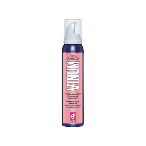 Крем-пенка Каллюзан "Венум" (Callusan Vinum) специально разработана для снятия и предупреждения отеков, тяжести и усталости в ногах. Это воздействие основано на сочетании экстракта из листьев красного винограда и конского каштана. Содержащиеся в них флавоноиды стимулируют вены и кровообращение, снимают неприятное ощущение тяжести и оказывают противовоспалительное воздействие. Освежающие компоненты (ментол) и увлажняющие (глицерин и карбамид) создают ощущение легкости и свежести. Длительный ухаживающий эффект придают масло Ши, масло жожоба и витамины.