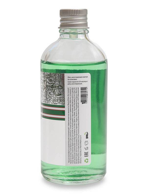 Очищенная вода с ионами серебра, сорбитол дериватив (полученный из оливкового масла), одноатомный спирт органического происхождения (propylol), парфюмерная композиция, эфирное масло эвкалипта, аллантоин, органический глицерин, феноксиэтанол, натуральный ментол, безопасный подготовленный краситель, цитронеллол, гераниол, цитрал, лимонене.