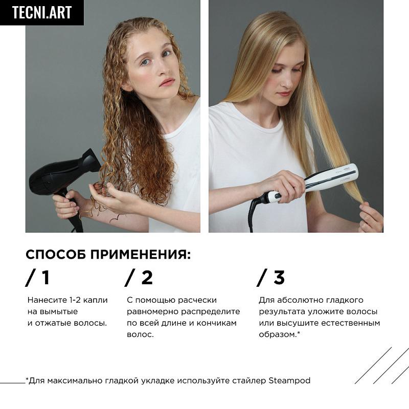 С помощью расчески распределите 1-2 капли геля по всей длине и кончикам волос. Для абсолютно гладкого результата высушите волосы феном