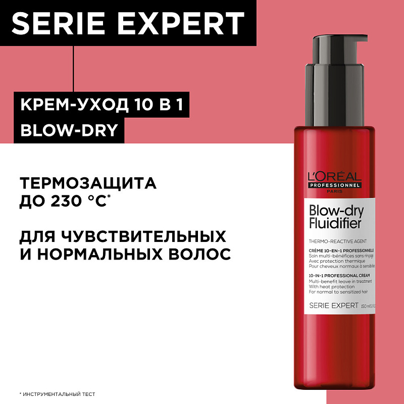 Термозащитный крем для волос Serie Exspert Blow Dry Fludifier французской марки L'oreal имеет среднюю фиксацию и предназначен для создания причёски на локонах любого типа и длины. Невесомая текстура продукта в формате флюида легко наносится, хорошо распределяется на прядях, быстро высыхает, не ощущается на волосах. Средство оставляет укладку подвижной и эластичной, она выглядит аккуратно и естественно, крем не склеивает и не утяжеляет локоны, надолго сохраняет причёску в первозданном виде до 4-х дней, обеспечивает защиту от воздействия внешних факторов окружающей среды, высоких температур и влажности.