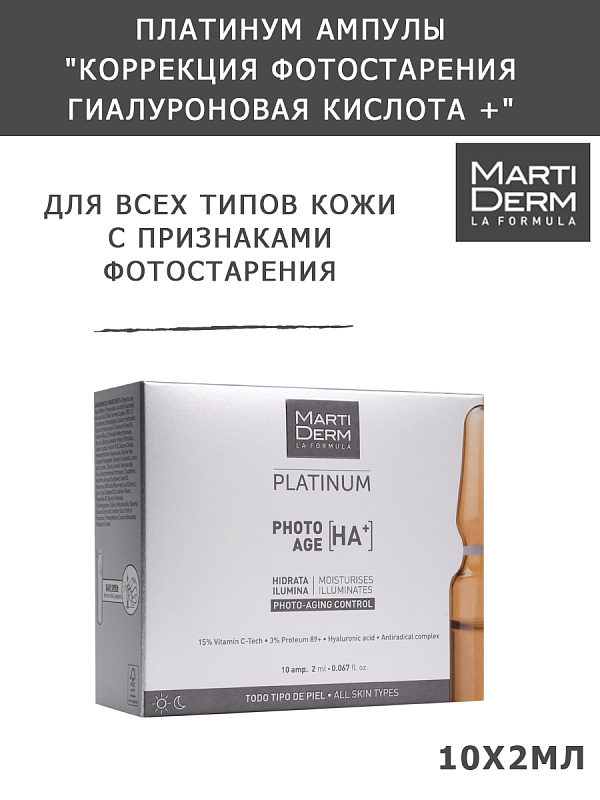 Martiderm Photo-Age Ampoules-это глобальный антивозрастной уход, который борется со всеми признаками преждевременного старения, такими как потеря сияния и упругости, морщины и пятна. С витамином С, протеогликанами и восстанавливающим комплексом.