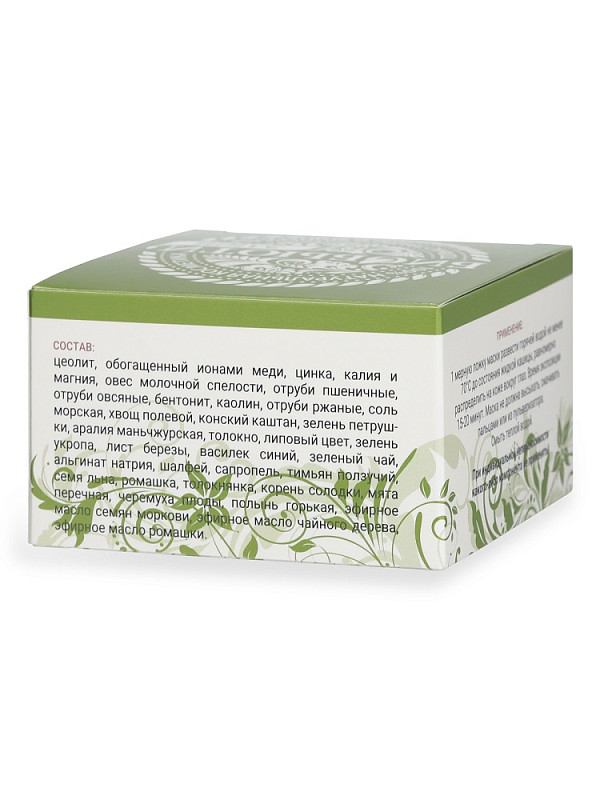 Состав: цеолит, обогащенный ионами меди, цинка, калия и магния, овес молочной спелости, отруби пшеничные, отруби овсяные, бентонит, каолин, отруби ржаные, соль морская, хвощ полевой, конский каштан, зелень петрушки, аралия маньчжурская, толокно, липовый цвет, зелень укропа, лист березы, василек синий, зеленый чай, альгинат натрия, шалфей, сапропель, тимьян ползучий, семя льна, ромашка, толокнянка, корень солодки, мята перечная, черемуха плоды, полынь горькая, эфирное масло семян моркови, эфирное масло чайного дерева, эфирное масло ромашки