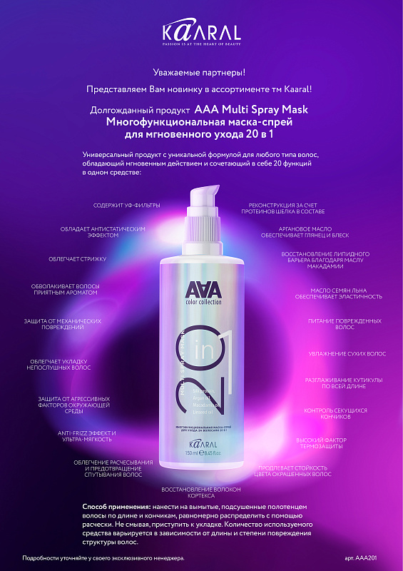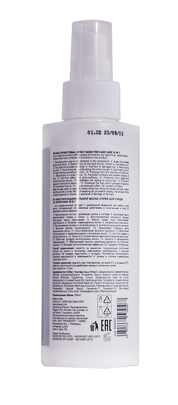 Универсальный продукт с уникальной формулой для любого типа волос, обладающий мгновенным действием и сочетающий в себе 20 функций в 1 средстве: