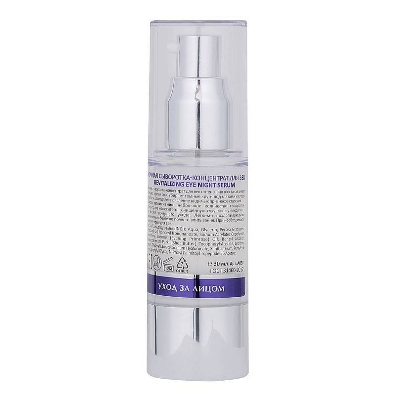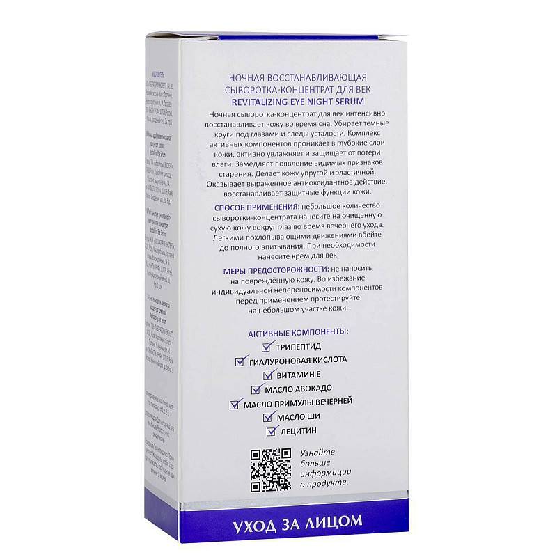 Ночная сыворотка-концентрат для век интенсивно восстанавливает кожу во время сна. Убирает темные круги под глазами и следы усталости. Комплекс активных компонентов проникает в глубокие слои кожи, активно увлажняет и защищает от потери влаги. Замедляет появление видимых признаков старения. Делает кожу упругой и эластичной. Оказывает выраженное антиоксидантное действие, восстанавливает защитные функции кожи.