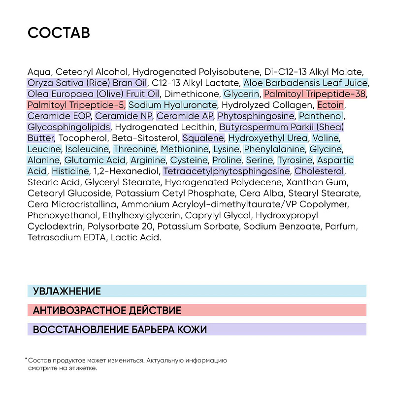 Состав: aqua, cetearyl alcohol, hydrogenated polyisobutene, di-c12-13 alkyl malate, oryza sativa (rice) bran oil, c12-13 alkyl lactate, aloe barbadensis leaf juice, olea europaea (olive) fruit oil, dimethicone, glycerin, palmitoyl tripeptide-38, palmitoyl tripeptide-5, sodium hyaluronate, hydrolyzed collagen, ectoin, ceramide eop, ceramide np, ceramide ap, phytosphingosine, panthenol, glycosphingolipids, hydrogenated lecithin, butyrospermum parkii (shea) butter, tocopherol, beta-sitosterol, squalene, hydroxyethyl urea, valine, leucine, isoleucine, threonine, methionine, lysine, phenylalanine, glycine, alanine, glutamic аcid, arginine, cysteine, proline, serine, tyrosine, aspartic аcid, histidine, 1,2-hexanediol, tetraacetylphytosphingosine, cholesterol, stearic acid, glyceryl stearate, hydrogenated polydecene, xanthan gum, cetearyl glucoside, potassium cetyl phosphate, cera alba, stearyl stearate, cera microcristallina, ammonium acryloyldimethyltaurate/vp copolymer, phenoxyethanol, ethylhexylglycerin, caprylyl glycol, hydroxypropyl cyclodextrin, polysorbate 20, potassium sorbate, sodium benzoate, parfum, disodium edta, lactic acid