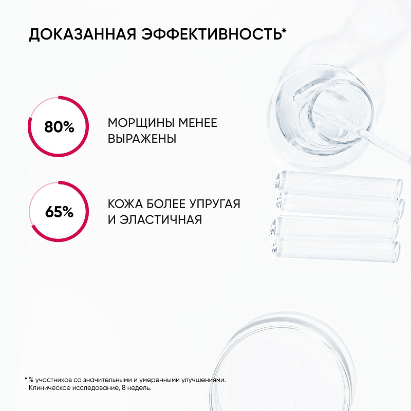 - пептидный комплекс - стимулирует выработку коллагена и гиалуроновой кислоты, повышает плотность кожи, уменьшает выраженность морщин и обеспечивает лифтинг-эффект
