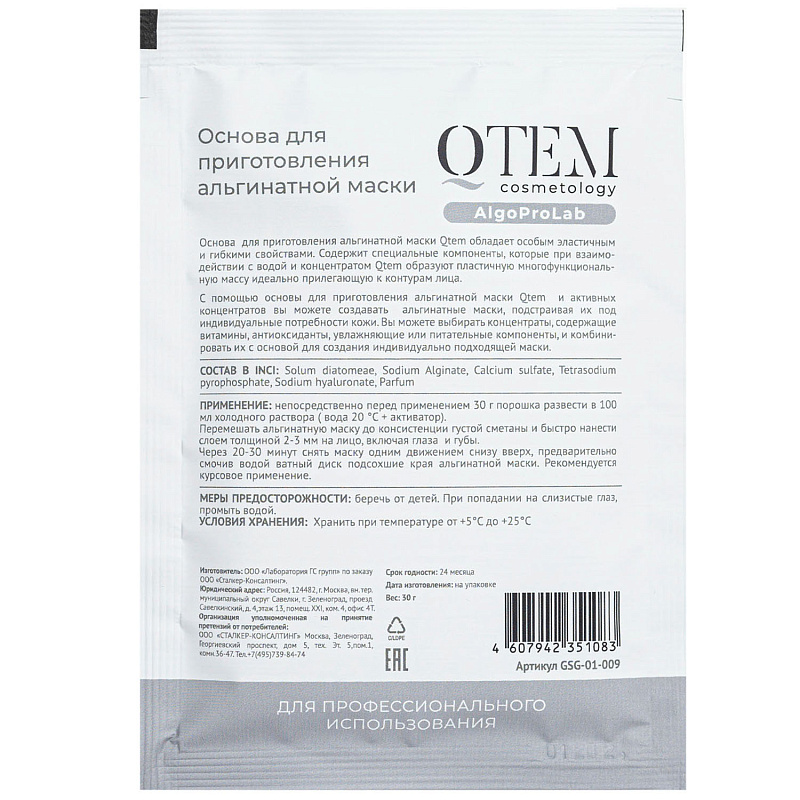 Основа для приготовления альгинатной маски бренда Qtem обладает особым эластичным и гибкими свойствами. Содержит специальные компоненты, которые при взаимодействии с водой и концентратом Qtem образуют пластичную многофункциональную массу, идеально прилегающую к контурам лица.