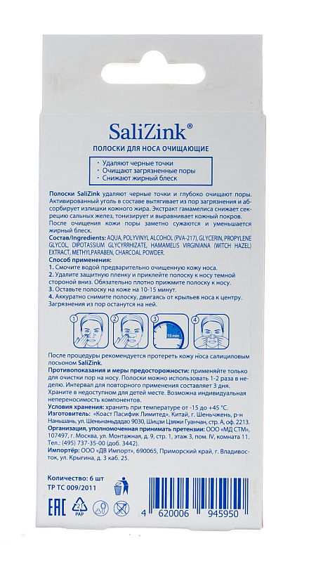 Полоски очищающие для носа с активированным углем и экстрактом гамамелиса, 6 шт