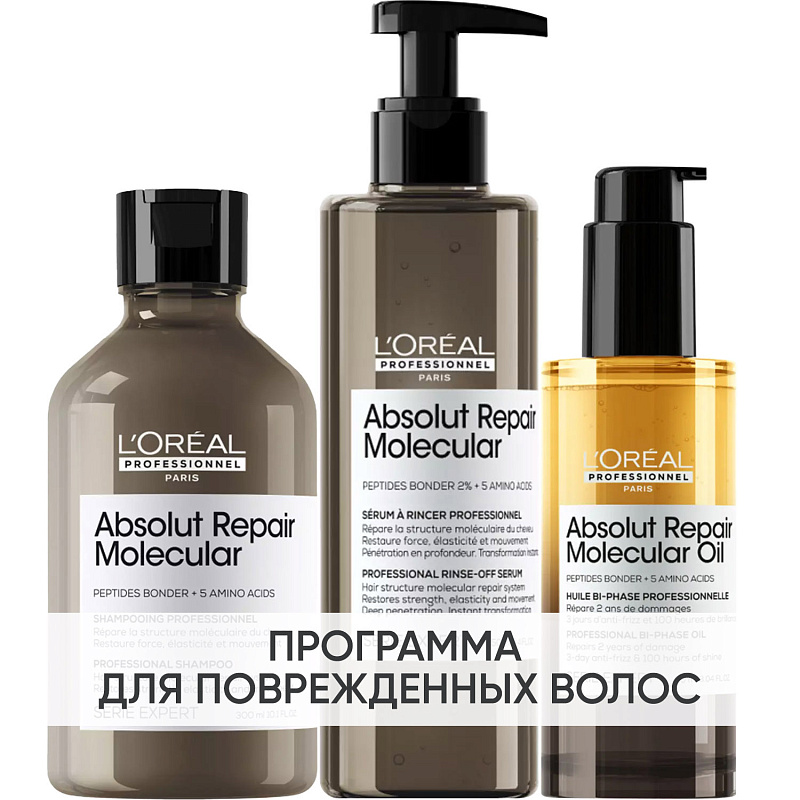 ПРОГРАММА КОМПЛЕКСНОГО УХОДА L'Oreal Professionnel Absolut Repair Molecular для поврежденных волос. Комплексный уход представляет собой дополняющие друг друга средства, совместное использование которых будет максимально эффективным. Первым шагом программы является базовый уход (очищение + питание).