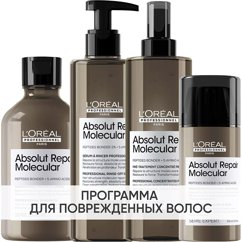 ПРОГРАММА КОМПЛЕКСНОГО УХОДА L'Oreal Professionnel Absolut Repair Molecular для поврежденных волос. Комплексный уход представляет собой дополняющие друг друга средства, совместное использование которых будет максимально эффективным. Первым шагом программы является базовый уход (очищение + питание).