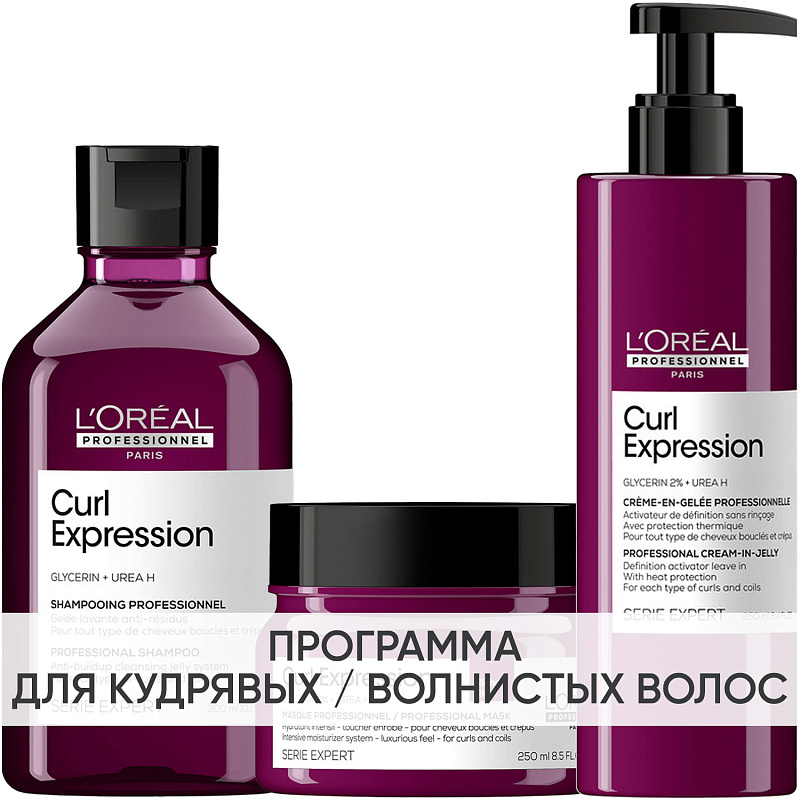 ПРОГРАММА КОМПЛЕКСНОГО УХОДА L'Oreal Professionnel Curl Expression для кудрявых и волнистых волос. Комплексный уход представляет собой дополняющие друг друга средства, совместное использование которых будет максимально эффективным. Первым шагом программы является базовый уход (очищение + питание), вторым – дополнительный уход (средства, усиливающие эффект базовой программы и применяемые постоянно или периодически).