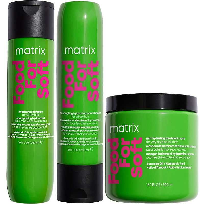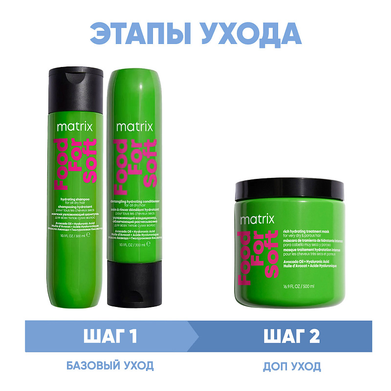 ПРОГРАММА КОМПЛЕКСНОГО УХОДА Matrix Food For Soft для сухих волос всех типов: пористых, волнистых, обесцвеченных, окрашенных, сильно поврежденных. Комплексный уход представляет собой дополняющие друг друга средства, совместное использование которых будет максимально эффективным. Первым шагом программы является базовый уход (очищение + питание), вторым – дополнительный уход (средства, усиливающие эффект базовой программы и применяемые постоянно или периодически).