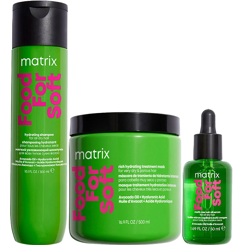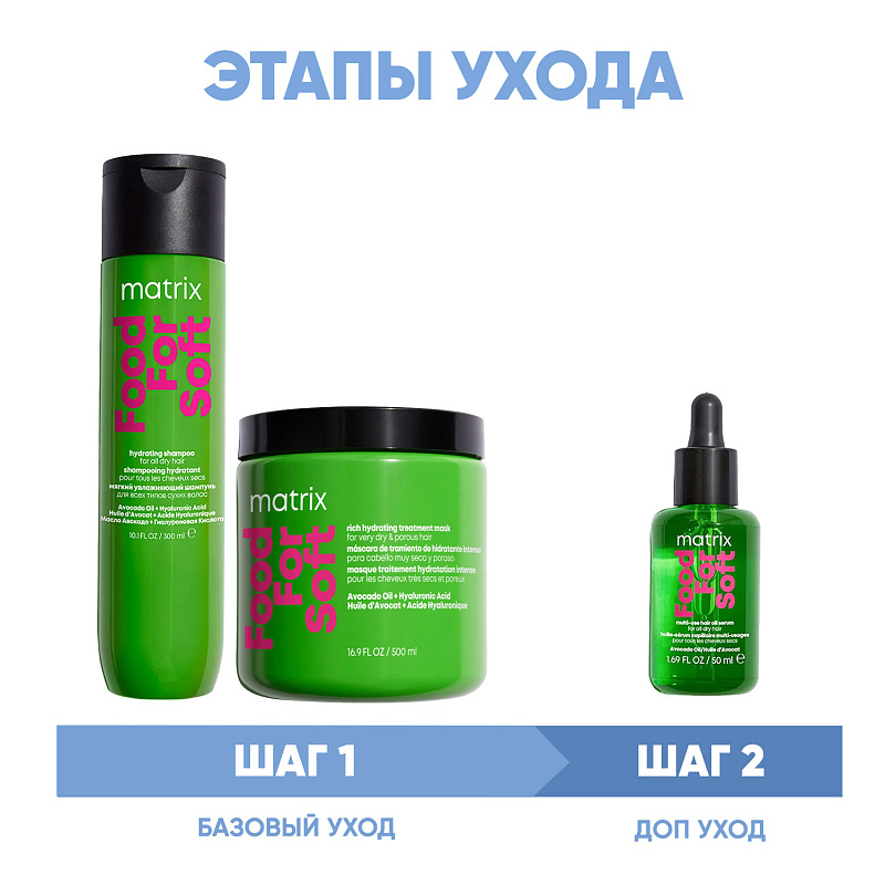 ПРОГРАММА КОМПЛЕКСНОГО УХОДА Matrix Food For Soft для сухих волос всех типов: пористых, волнистых, обесцвеченных, окрашенных, сильно поврежденных. Комплексный уход представляет собой дополняющие друг друга средства, совместное использование которых будет максимально эффективным. Первым шагом программы является базовый уход (очищение + питание), вторым – дополнительный уход (средства, усиливающие эффект базовой программы и применяемые постоянно или периодически).