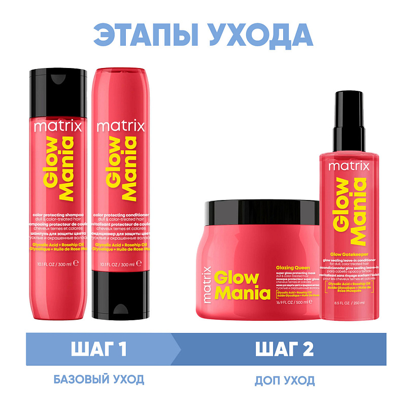 ПРОГРАММА КОМПЛЕКСНОГО УХОДА Matrix Glow Mania для окрашенных и тусклых волос. Комплексный уход представляет собой дополняющие друг друга средства, совместное использование которых будет максимально эффективным. Первым шагом программы является базовый уход (очищение + питание), вторым – дополнительный уход (средства, усиливающие эффект базовой программы и применяемые постоянно или периодически).