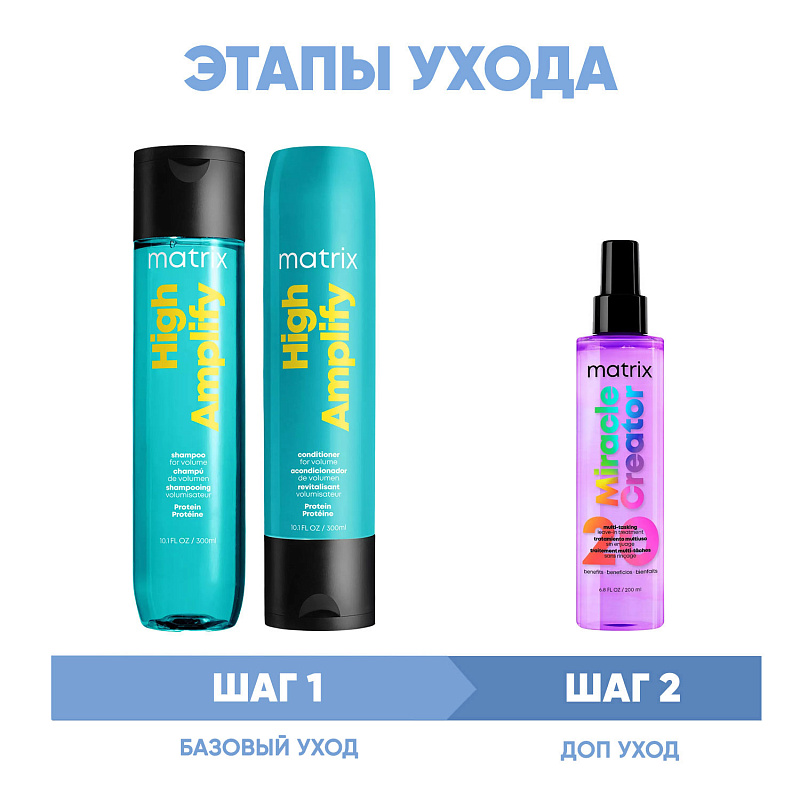 ПРОГРАММА КОМПЛЕКСНОГО УХОДА Matrix High Amplify для увеличения объема и густоты волос. Комплексный уход представляет собой дополняющие друг друга средства, совместное использование которых будет максимально эффективным. Первым шагом программы является базовый уход (очищение + питание), вторым – дополнительный уход (средства, усиливающие эффект базовой программы и применяемые постоянно или периодически).