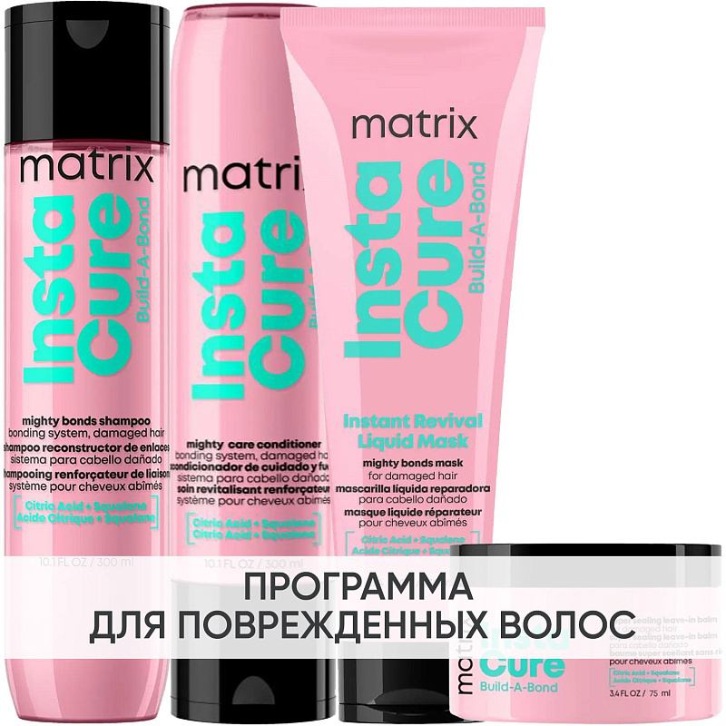 ПРОГРАММА КОМПЛЕКСНОГО УХОДА Matrix Instacure Build-A-Bond для поврежденных волос. Комплексный уход представляет собой дополняющие друг друга средства, совместное использование которых будет максимально эффективным. Первым шагом программы является базовый уход (очищение + питание), вторым – дополнительный уход (средства, усиливающие эффект базовой программы и применяемые постоянно или периодически).