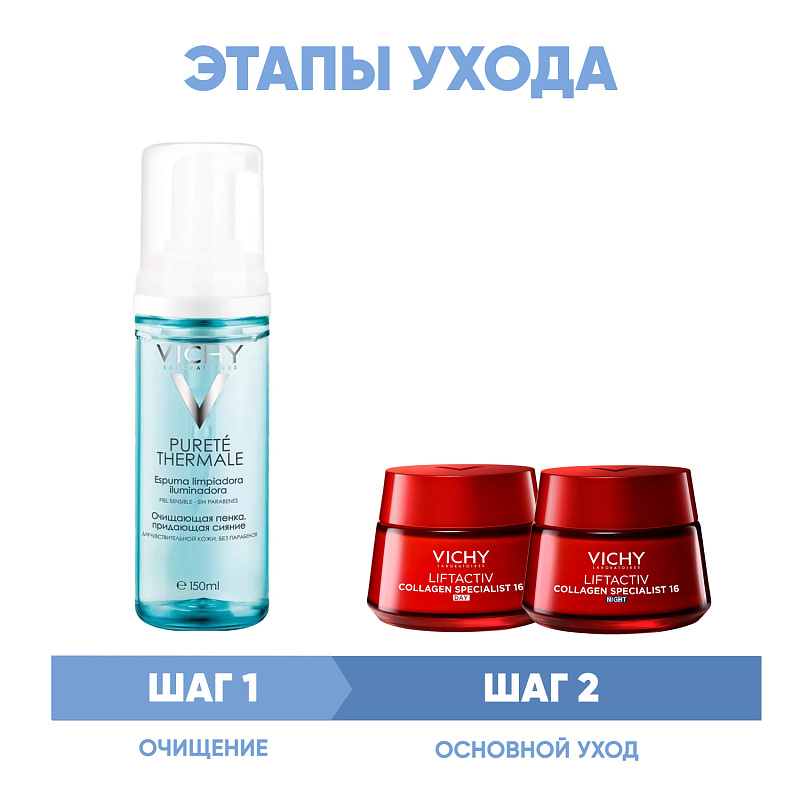 ПРОГРАММА КОМПЛЕКСНОГО УХОДА Vichy Liftactiv Collagen Specialist для борьбы с признаками старения. Комплексный уход представляет собой дополняющие друг друга средства, совместное использование которых будет максимально эффективным. Первым шагом программы является очищение, вторым - основной уход.