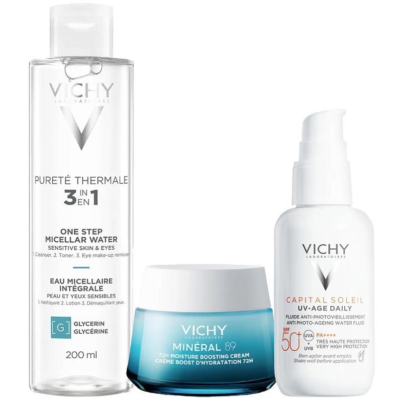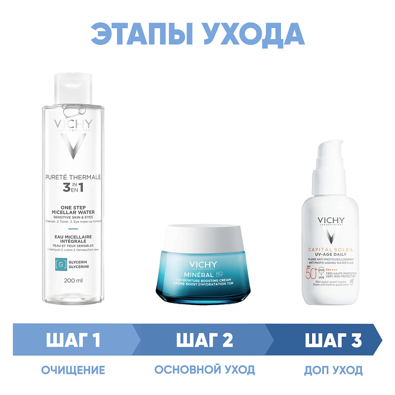 ПРОГРАММА КОМПЛЕКСНОГО УХОДА Vichy Mineral 89 для увлажнения и укрепления кожи, а также борьбы с первыми признаками старения. Комплексный уход представляет собой дополняющие друг друга средства, совместное использование которых будет максимально эффективным. Первым шагом программы является очищение, вторым - основной уход. В третий шаг вошли дополнительные средства, усиливающие эффект основной программы и применяемые постоянно или периодически на различных этапах ухода.