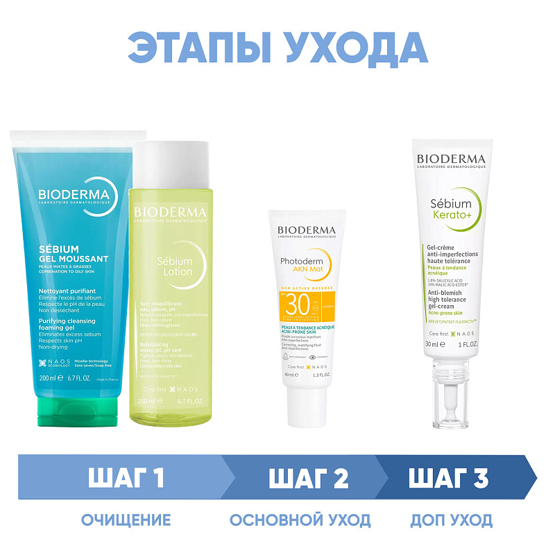 ПРОГРАММА КОМПЛЕКСНОГО УХОДА для жирной и комбинированной кожи лица с тенденцией к акне. Комплексный уход представляет собой дополняющие друг друга средства, совместное использование которых будет максимально эффективным. Первым шагом такой программы всегда является очищение, вторым - основной уход.