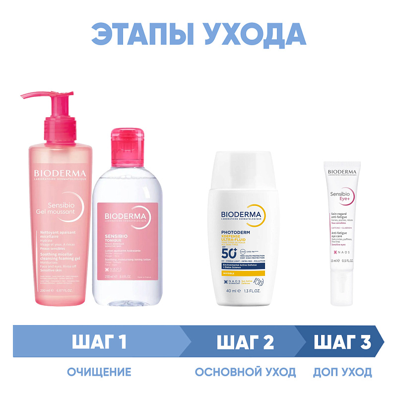 ПРОГРАММА КОМПЛЕКСНОГО УХОДА Bioderma Sensibio для чувствительной кожи, склонной к покраснениям, раздражениям, к появлению аллергии, купероза, розацеа и дерматита. Комплексный уход представляет собой дополняющие друг друга средства, совместное использование которых будет максимально эффективным. Первым шагом программы является очищение, вторым - основной уход. В третий шаг входят дополнительные средства, усиливающие эффект основной программы и применяемые постоянно или периодически на различных этапах ухода.