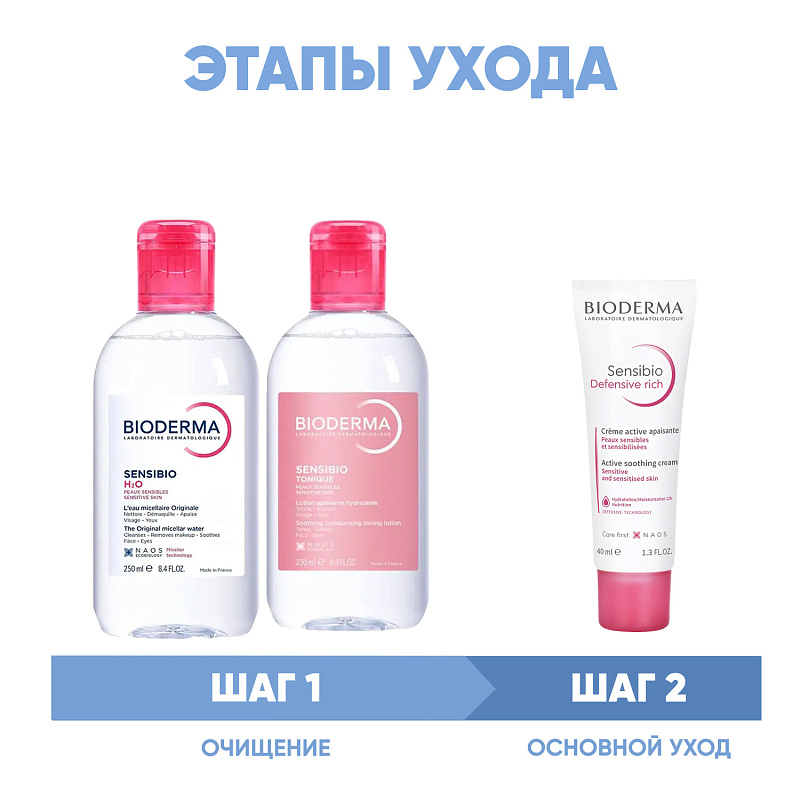 ПРОГРАММА КОМПЛЕКСНОГО УХОДА Bioderma Sensibio для чувствительной кожи, склонной к покраснениям, раздражениям, к появлению аллергии, купероза, розацеа и дерматита. Комплексный уход представляет собой дополняющие друг друга средства, совместное использование которых будет максимально эффективным. Первым шагом программы является очищение, вторым - основной уход. В третий шаг входят дополнительные средства, усиливающие эффект основной программы и применяемые постоянно или периодически на различных этапах ухода.