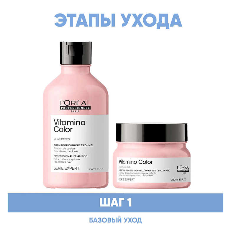 ПРОГРАММА КОМПЛЕКСНОГО УХОДА L'oreal Professionnel Vitamino Color для защиты цвета окрашенных волос. Комплексный уход представляет собой дополняющие друг друга средства, совместное использование которых будет максимально эффективным. Первым шагом программы является базовый уход (очищение + питание), вторым – дополнительный уход (средства, усиливающие эффект базовой программы и применяемые постоянно или периодически).