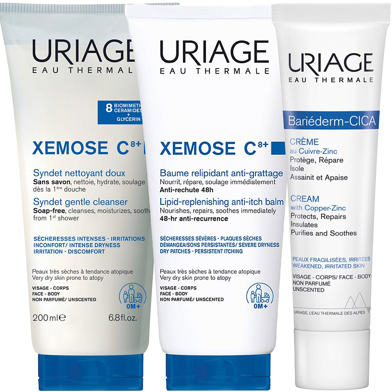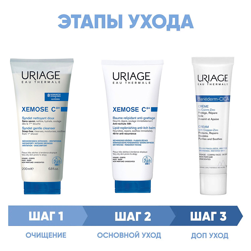 ПРОГРАММА КОМПЛЕКСНОГО УХОДА Uriage Xemose для сухой и очень сухой кожи, склонной к атопии. Комплексный уход представляет собой дополняющие друг друга средства, совместное использование которых будет максимально эффективным. Первым шагом программы является очищение, вторым - основной уход. В третий шаг вошли дополнительные средства, усиливающие эффект основной программы и применяемые постоянно или периодически на различных этапах ухода.