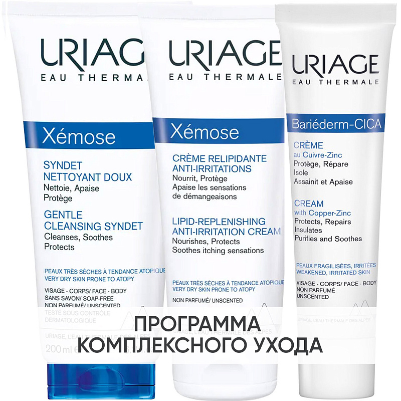 ПРОГРАММА КОМПЛЕКСНОГО УХОДА Uriage Xemose для сухой и очень сухой кожи, склонной к атопии. Комплексный уход представляет собой дополняющие друг друга средства, совместное использование которых будет максимально эффективным. Первым шагом программы является очищение, вторым - основной уход. В третий шаг вошли дополнительные средства, усиливающие эффект основной программы и применяемые постоянно или периодически на различных этапах ухода.