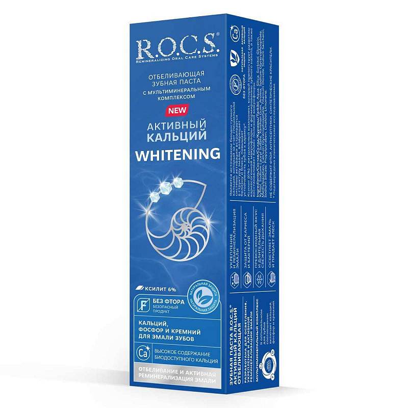 Компонентной основой отбеливающей зубной пасты R.O.C.S. «Активный Кальций» является запатентованный мультиминеральный комплекс, в состав которого включены основные необходимые компоненты – магний, фосфор, кальций и кремний, содержащиеся в пропорциях, оптимальных для здоровья зубов и ротовой полости. Дополнительный положительный эффект оказывает натуральный компонент ксилитол (6%), снижающий развитие кариесогенной микрофлоры.