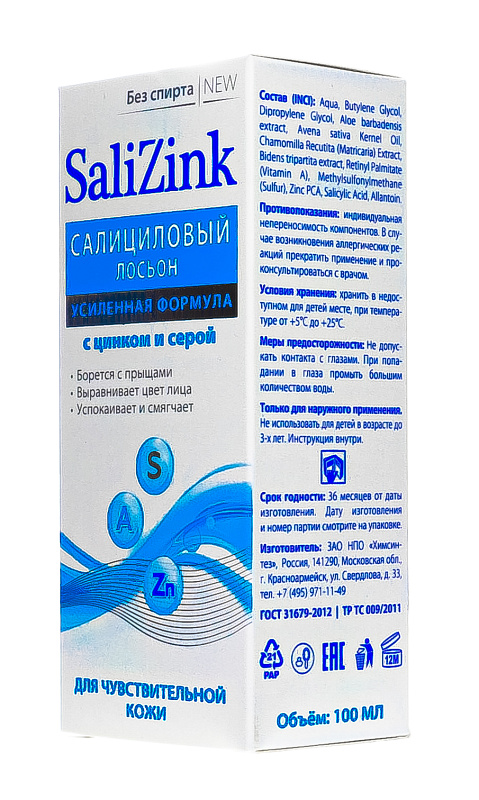 Салициловый лосьон с цинком и серой без спирта для чувствительной кожи, 100 мл