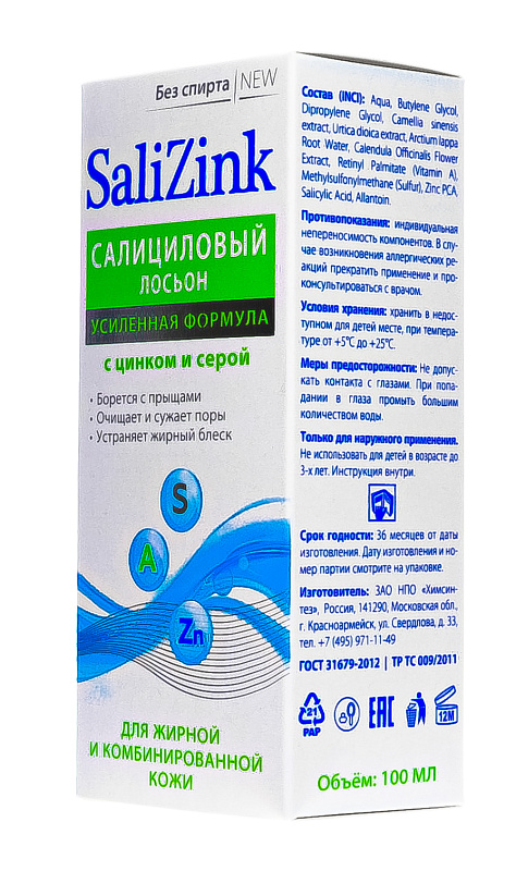 Салициловый лосьон с цинком и серой для жирной и комбинированной кожи без спирта, 100 мл