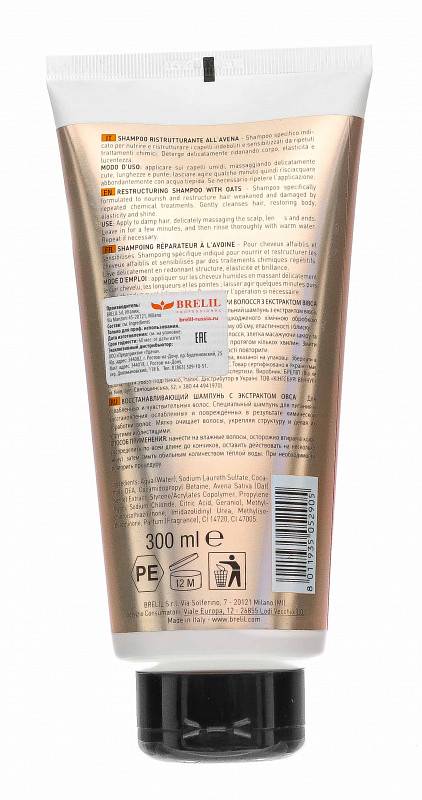 Восстанавливающий шампунь от бренда Brelil на основе экстракта овса предназначен для интенсивного питания и восстановления ослабленных и чувствительных волос. При применении образует на поверхности волос тончайшую пленку, которая обеспечивает эффективную защиту и заметно восстанавливает их. Шампунь нежно очищает волосы и кожу головы, придавая волосам эластичность, упругость и блеск.