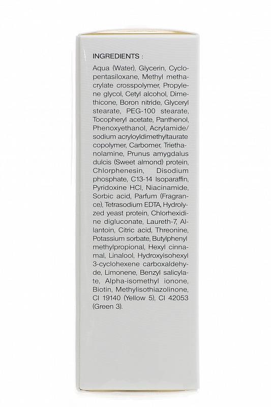 Гидролизированные протеины дрожжей (содержат аминокислоты, витамины и ферменты) стимулируют регенерацию, увлажняют, успокаивают кожу, снимают воспалительные реакции, обеспечивают антиоксидантную защиту. Адсорбирующая пудра поглощает продукты избыточной секреции сальных желез. Триклозан – антибактериальный агент широкого спектра действия, обладает противовоспалительными и противогрибковыми свойствами. Витамин РР (никотиновая кислота) стимулирует образование структурных липидов эпидермиса, оказывает сосудоукрепляющее действие, улучшает микроциркуляцию. Витамин B6 (пиридоксин) – мощный антиоксидант, способствует клеточной регенерации, нормализует липидный обмен, стимулирует обменные процессы в коже. Витамин Н (биотин) регулирует белковый и жировой обмен, регулирует деятельность сальных желез, улучшает структуру кожи. Пантенол (провитамин B5) оказывает успокаивающее и регенерирующее действие, стимулирует образование коллагена и эластина, увеличивает прочность коллагеновых волокон. Протеины сладкого миндаля оказывают мгновенный лифтинг-эффект, укрепляют, разглаживают кожу, повышают тонус, улучшают микрорельеф. Аллантоин стимулирует обновление клеток эпидермиса, смягчает, увлажняет, потенцирует эффекты других биологически активных веществ и витаминов. Обладает бактерицидными и иммуномодулирующими свойствами.