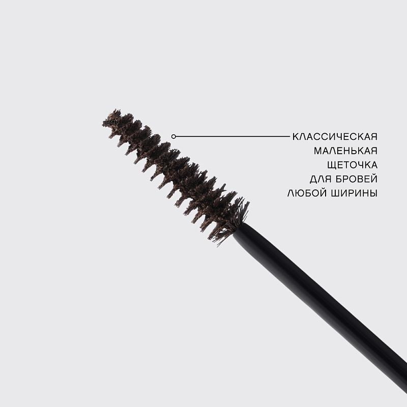 Тушь обволакивает каждый волосок, делая цвет бровей насыщеннее или приглушая темный натуральный тон, придает здоровый блеск, объем и аккуратно фиксирует форму. Благодаря особым частичкам в кремовой текстуре она сочетается с естественным оттенком бровей. Формула туши содержит увлажняющие компоненты для ухода за волосками и кожей в области бровей, защиты от вредного воздействия внешних факторов.