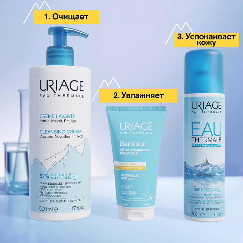 - термальная вода Урьяж – природная изотоническая вода. Она находится в полном осмотическом равновесии с клетками эпидермиса и их естественной средой. Уникальная концентрация минеральных элементов делает воду Урьяж великолепным средством для ухода за кожей. Термальная вода Урьяж прошла испытания, подтвердившие её изотоничность, увлажняющий эффект, противовоспалительное и антирадикальное действие, эффект улучшения клинических признаков псориаза, прекрасную переносимость. Термальную воду Урьяж можно поистине назвать «Живой водой»