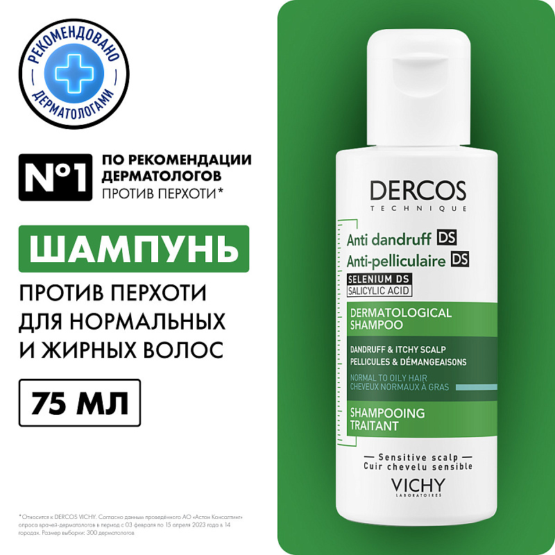 Интенсивный шампунь-уход против перхоти для нормальной и жирной кожи головы, 75 мл