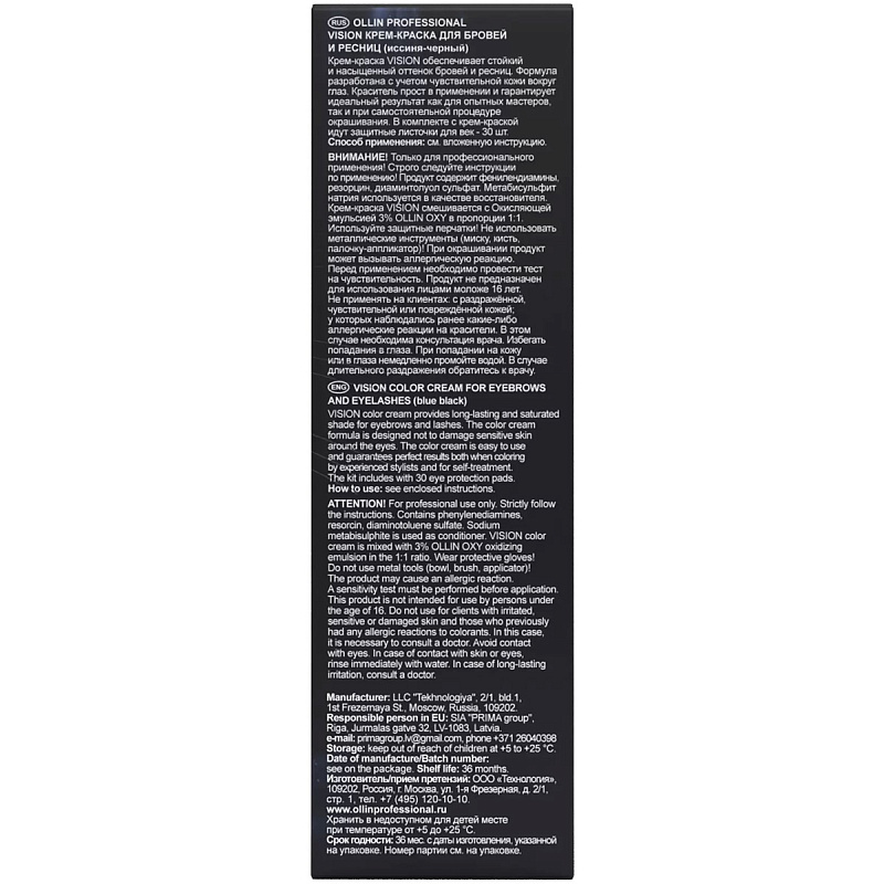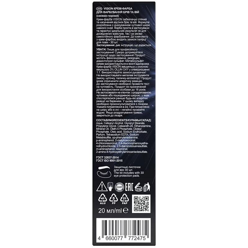 Крем-краска VISION обеспечивает стойкий и насыщенный оттенок бровей и ресниц. Формула разработана с учетом чувствительной кожи вокруг глаз. Краситель прост в применении и гарантирует идеальный результат как для опытных мастеров, так и при самостоятельной процедуре окрашивания.