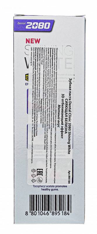 Зубная паста отбеливающая 2080 "Сияющия Белизна", KeraSys с системой бережного отбеливания зубов. 3D отбеливающий эффект. Мелкодисперсные гранулы проникают в отдаленные уголки полости рта, эффективно удаляют налет с поверхности зубов, не стирая эмаль. Тетрапирофосфат натрия предотвращает появление зубного камня. Витамин Е препятствует развитию заболеваний десен. Отбеливание. Мелкодисперсные абразивно-полирующие гранулы проникают в самые отдаленные уголки полости рта, эффективно удаляют зубную бляшку и бактериальный налет и, не стирая эмаль, полируют поверхность зубов, обеспечивая 3-D отбеливающий эффект. Профилактика зубного камня. Тетрапирофосфат натрия предотвращает появление зубного камня, являющегося основной причиной изменения цвета зубной эмали. Уход за деснами. Витамин Е (токоферола ацетат) стимулирует кровообращение в деснах, препятствует образованию гингивита и неприятного запаха