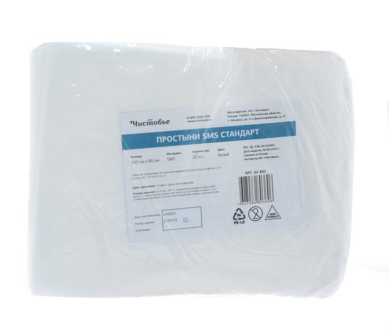 Простыня SMS Стандарт Белый 200 х 80, 1 х 20 шт