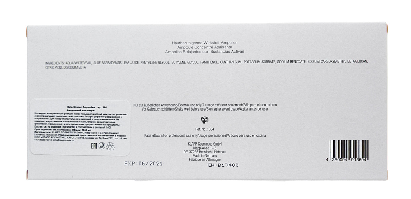 Ампульный концентрат Beta Glucan предназначен для интенсивного ухода за кожей, склонной к аллергическим реакциям. Высококонцентрированный препарат укрепляет защитную систему кожи изнутри, помогает блокировать аллергены, запускает восстановительные механизмы кожи. Концентрат быстро и эффективно снимает покраснение, успокаивает и осветляет аллергичную кожу. Кожа становится мягкой и нежной, ее поверхность - ровной и гладкой.