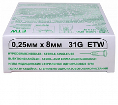 Иглы медицинские стерильные одноразовые SFM 0,25мм х 8 мм 31G ETW (50 шт/уп)