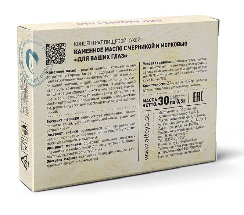 Каменное масло с черникой и морковью «Для ваших глаз», 30 капсул х 500 мг