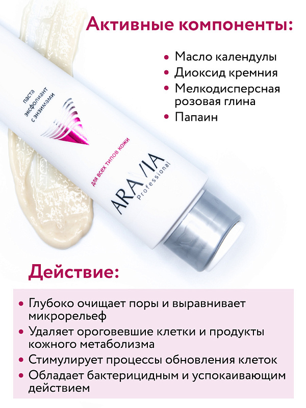 Мягкий эксфолиант бережно и эффективно очищает кожу от загрязнений, удаляет ороговевшие клетки и продукты кожного метаболизма. Средство сочетает в себе свойства энзимного и абразивного пилинга. Диоксид эко-кремния обеспечивает мягкое механическое воздействие, выравнивает микрорельеф кожи, глубоко очищает поры. Папаин, благодаря своим кератолитическим свойствам, полирует и разглаживает кожу, стимулирует процессы обновления клеток. Входящая в состав розовая глина обладает бактерицидным и успокаивающим действием. Паста предназначена для всех типов кожи: улучшает состояние жирной кожи, обновляет и увлажняет сухую, тонизирует и улучшает внешний вид возрастной кожи.