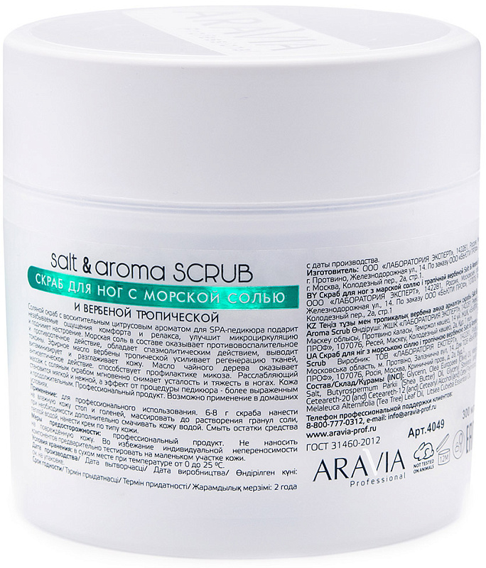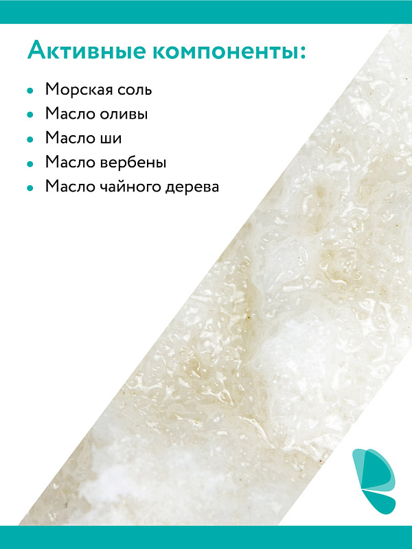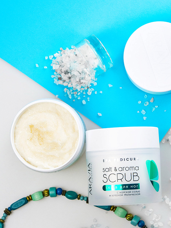 Соляной скраб с маслом тропической вербены и чайного дерева. Предназначен для расслабляющего SPA-педикюра. Цитрусовый аромат бодрит и поднимает настроение. Морская соль оказывает противовоспалительное и спазмолитическое действие. Избавляет от отёков и выводит токсины. Эфирное масло вербены тропической усиливает регенерацию тканей. Витаминизирует и разглаживает кожу. Масло чайного дерева оказывает антисептическое действие. Способствует профилактике микоза. Массаж с соляным скрабом мгновенно снимает тяжесть в ногах. Улучшается циркуляция крови, кожа становится мягкой и нежной. Появляется ощущение комфорта и релакса, усиливается и продлевается эффект от педикюра.
