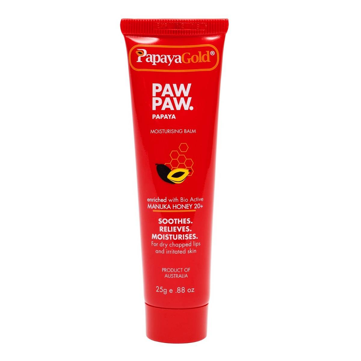 Универсальный австралийский бальзам Papaya Gold великолепно увлажняет кожу губ, лица и тела, избавляет ее от сухости, снимает раздражение, и даже обладает лечебным эффектом. Идеально подходит для питания сухих, потрескавшихся губ, отлично увлажняет колени, локти, кутикулу. В основе состава Papaya Gold экстракт папайи и мед манука.