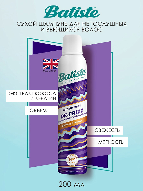 Сухой шампунь Batiste De-Frizz восстанавливает объем и освежает вид волос. Усовершенствованная формула с кокосом нацелится на самые вьющиеся участки ваших волос, делая их мягкими и гладкими, при этом удаляя излишки жира. Легкие и без белого налета, волосы мгновенно выглядят и чувствуют себя послушными после всего лишь одного использования