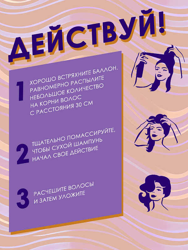 Наслаждайтесь эффектом чистых волос без мытья. Впитывает кожный жир, придает форму и стойкость укладке, помогает дольше сохранять волосы чистыми после мытья, освежает волосы и делает их более воздушными.